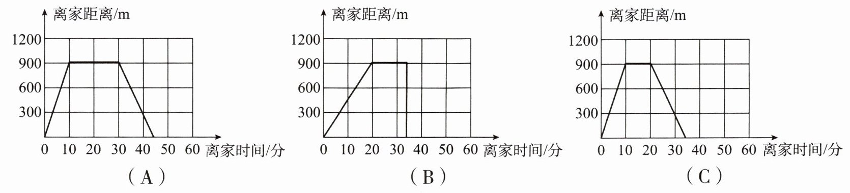 2. 聪聪从家出发,10 分钟后到达离家 900 m 处的超市,购物 10 分钟后,又用 15 分钟返回家中。下面能描述聪聪离家时间和离家距离之间关系的图是( )。