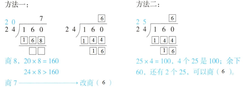一、填一填(计算 $160÷24$,用不同的方法来试商)。