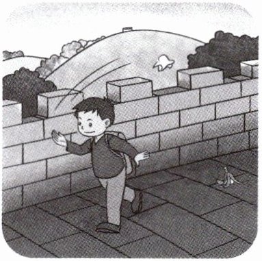 图画中的小男孩正在向墙外扔垃圾,这种行为是不文明的,会污染环境。