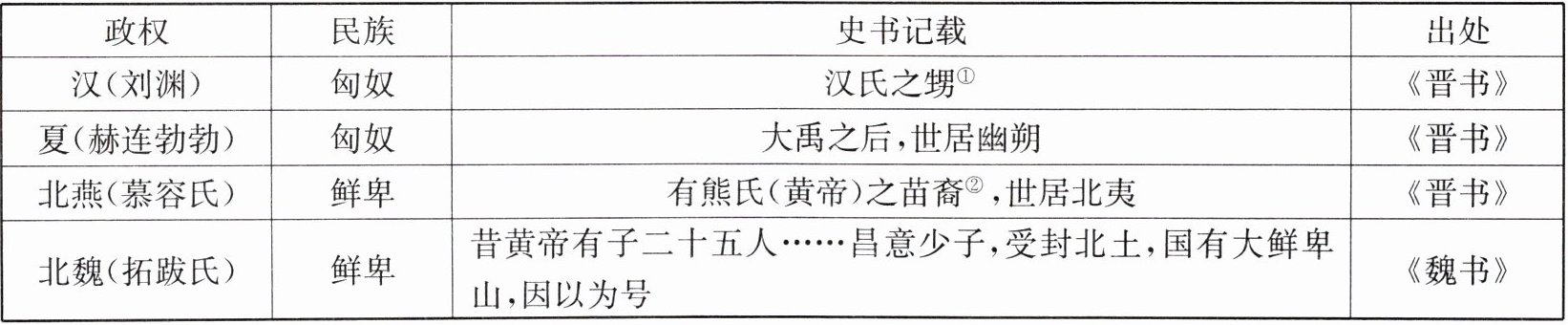 7. 魏晋南北朝时期,部分民族政权的创立者对其祖先的追述如下:
