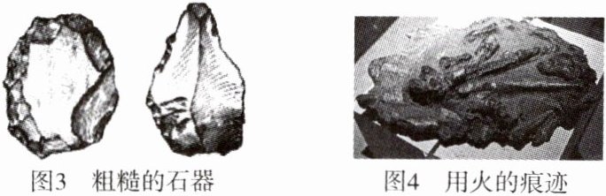 图3为打制石器,说明人类会制作工具,使用这种粗糙的打制石器。图4说明人类已经会使用火。(结合图片,符合史实即可)