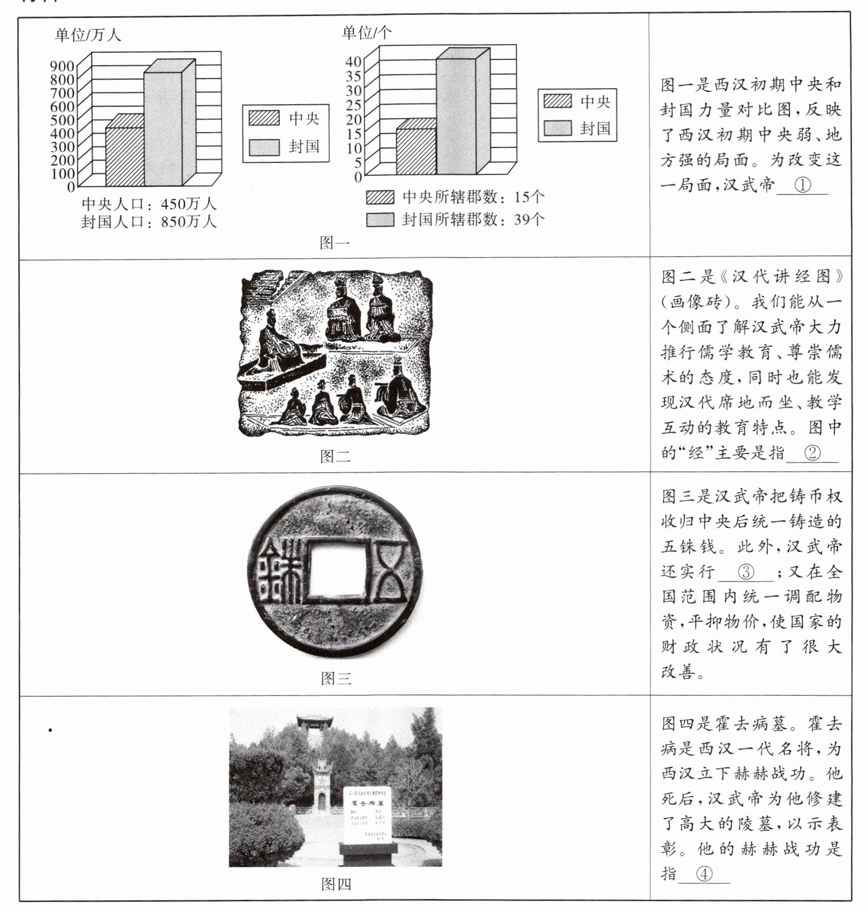 (2) 以上四幅图片分别反映了汉武帝哪四个方面(或领域)的措施?综合四幅图片,归纳这一时期的时代主题。