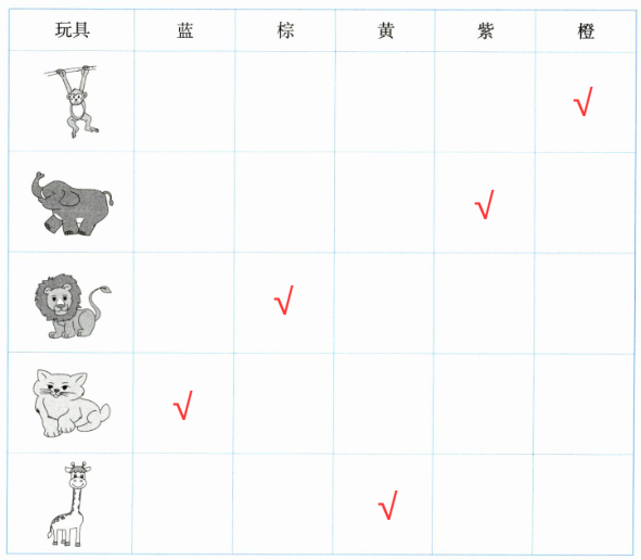 五、听录音,勾出(√)琦琦的玩具动物们相应的颜色。