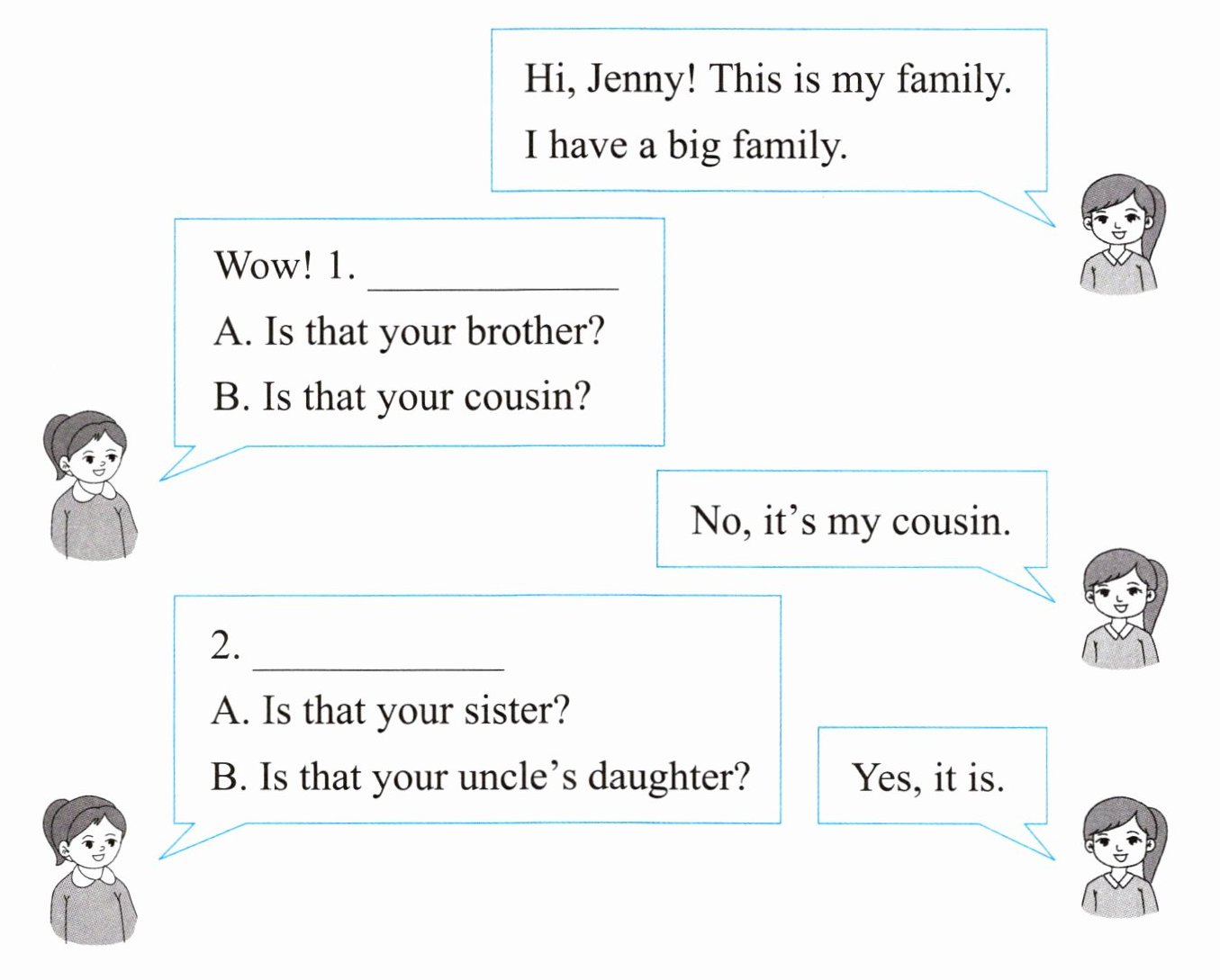 二、请根据上一题的家庭树,选择正确的选项完成对话。