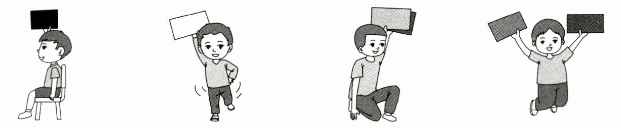 )A. Pink and red, touch the ground. B. Black, black, sit down.