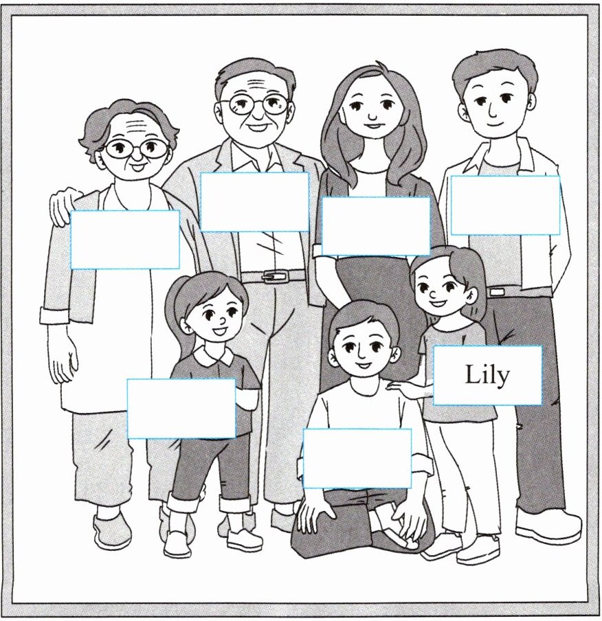 1. 请将下面家庭成员的序号标注在照片中,其中有一个多余选项。