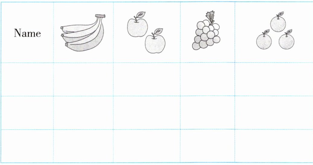 四、请你调查一下家人们喜欢的水果,统计出最受欢迎的两种水果,并在购物清单中画√。(表格不够用可以自制)