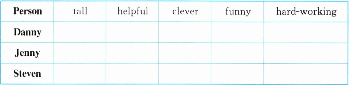 $\hline Person & tall & helpful & clever & funny & hard-working \\$