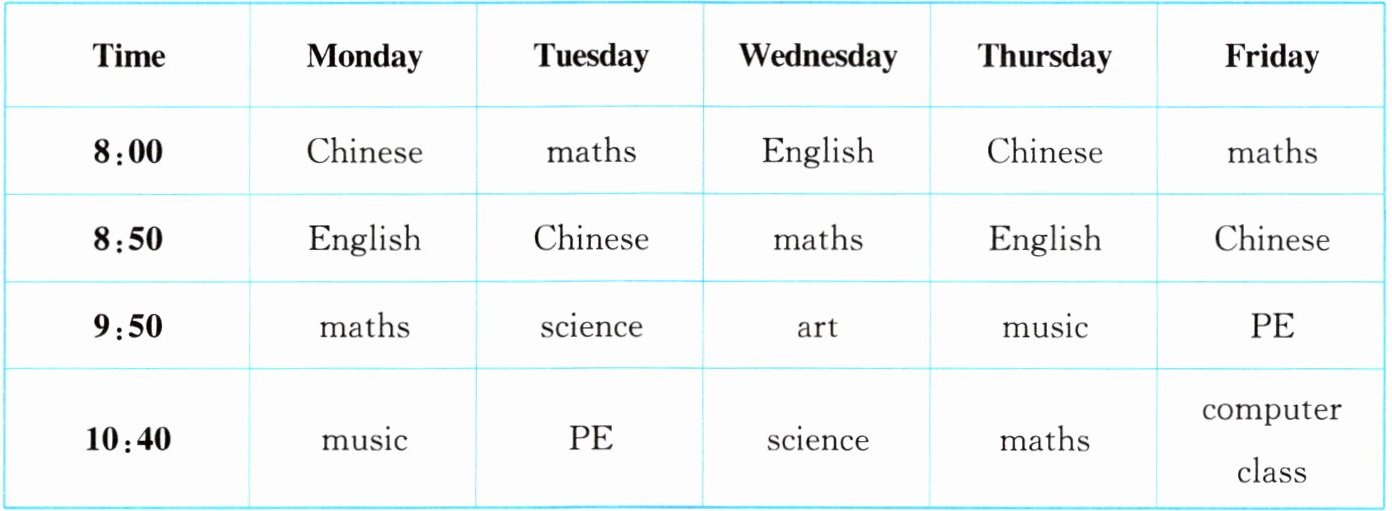 1. Chinese, English, maths, music 2. maths, Chinese, science, PE 3. Chinese, English, music, maths 4. Fridays 5. Mondays, Thursdays