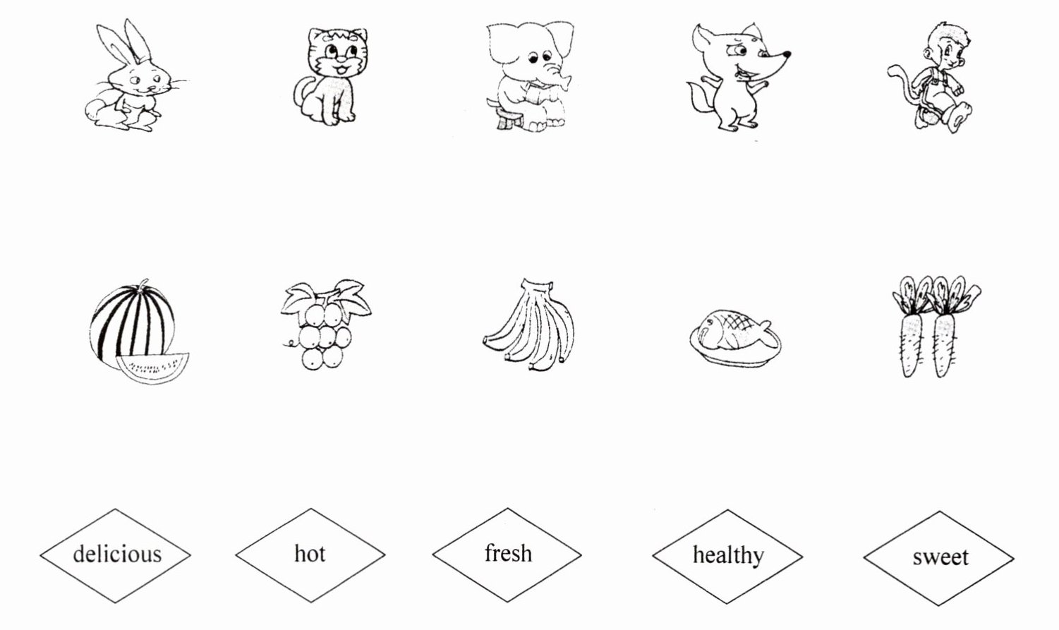 十二、读对话,将动物们与它们喜欢吃的食物及适当的形容词连线