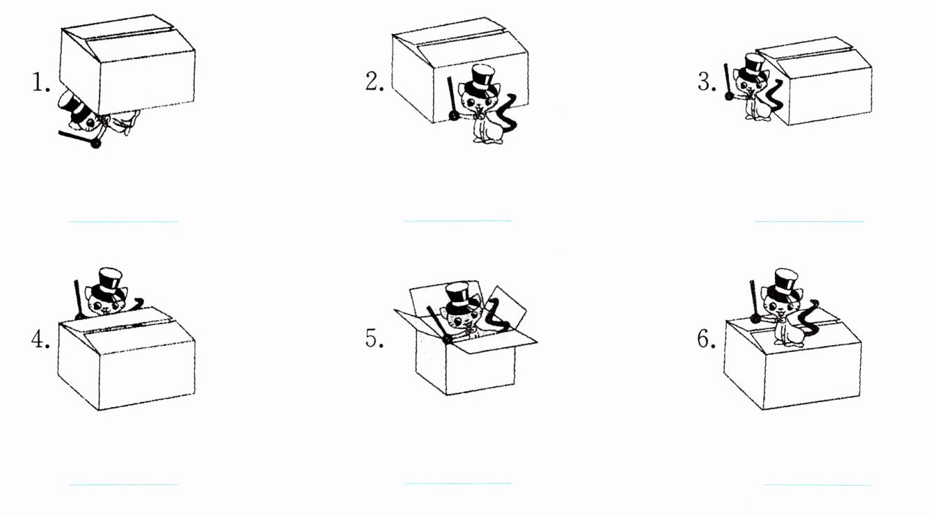 一、看图片,小猫在盒子哪里,写出合适的方位介词