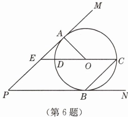 6. 如图,$PM$,$PN是\odot O$的切线,切点分别是$A$,$B$,过点$O的直线CE// PN$,交$\odot O于点C$,$D$,交$PM于点E$,若$BC// PM$,求$\angle P$的度数。