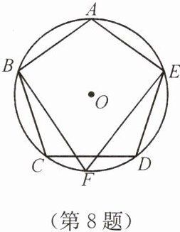 8. 如图,正五边形 ABCDE 内接于⊙O,点 F 在$\overset{\frown}{CD}$上,则∠BFE 的度数为______度。