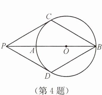 4. 如图,P 为⊙O 的直径 BA 延长线上的一点,PC 与⊙O 相切,切点为 C,点 D 是⊙上一点,连接 PD,PC = PD = BC。下列结论:①PD 与⊙O 相切;②四边形 PCBD 是菱形;③PO = AB;④∠PDB = 120°。其中正确的个数为( )