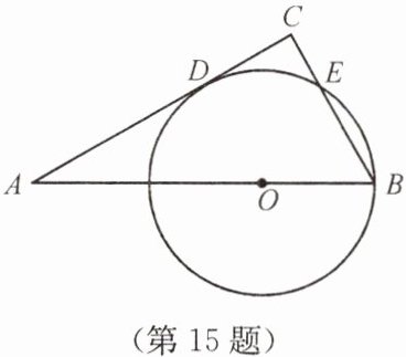 15. (8 分)如图,Rt△ABC 中,∠C = 90°,BC = 3,点 O 在 AB 上,OB = 2,以 OB 长为半径的⊙O 与 AC 相切于点 D,交 BC 于点 E。