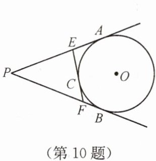 10. 如图,PA,PB 分别与⊙O 相切于点 A,B,⊙O 的切线 EF 分别交 PA,PB 于点 E,F,切点 C 在$\overset{\frown}{AB}$上,若 PA 长为 2,则△PEF 的周长是______。