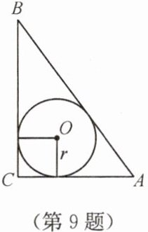 9. 如图,在 Rt△ABC 中,∠C = 90°,AC = 6,BC = 8,则△ABC 的内切圆半径 r = ______。
