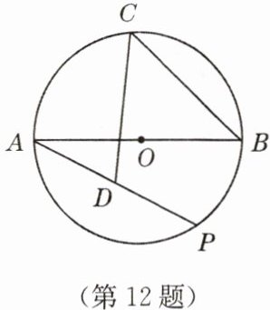 12. 如图,AB 是⊙O 的直径,AB = $4\sqrt{2}$,C 为$\overset{\frown}{AB}$中点,点 P 是⊙O 上一个动点,取弦 AP 的中点 D,则 CD 的最大值为______。