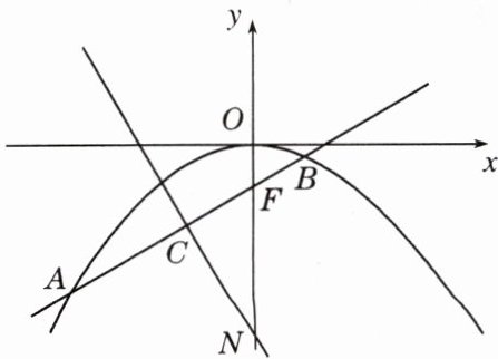 如图,过点 $ F(0, -1) $ 的直线 $ y = kx + b(k \neq 0) $ 与抛物线 $ y = -\frac{1}{4}x^{2} $ 交于点 $ A(x_{1}, y_{1}) $,$ B(x_{2}, y_{2}) $。