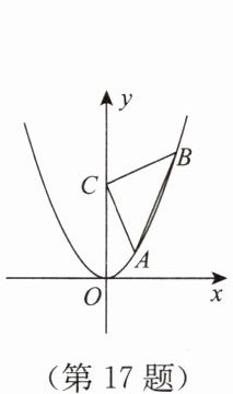 17. 如图,在等腰直角三角形 $ ABC $ 中,$ \angle ACB = 90^{\circ} $,点 $ A $,$ B $ 在抛物线 $ y = x^{2} $ 上,点 $ C $ 在 $ y $ 轴上,$ A $,$ B $ 两点的横坐标分别为 1 和 $ b(b > 1) $,则 $ b $ 的值为 。