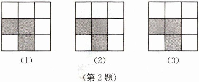 2. 下列 $3×3$ 网格图都是由 $9$ 个相同的小正方形组成的,每个网格图中有 $3$ 个小正方形已涂上阴影,请在余下的 $6$ 个空白小正方形中,按下列要求涂上阴影: