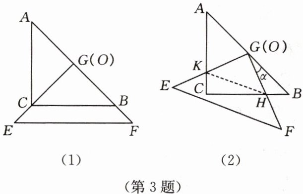 3. 把两个全等的等腰直角三角板 $ ABC $ 与 $ EFG $(其直角边长都为 4)叠放在一起,且使三角板 $ EFG $ 的直角顶点 $ G $ 与三角板 $ ABC $ 的斜边中点 $ O $ 重合 [如图(1)]. 现将三角板 $ EFG $ 绕点 $ O $ 顺时针旋转(旋转角 $ \alpha $ 满足 $ 0° < \alpha < 90° $),四边形 $ CHGK $ 是旋转过程中两个三角板的重叠部分 [如图(2)].