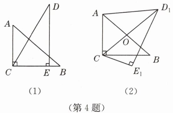 4. 把一副三角板如图(1)放置,其中 $ \angle ACB = \angle DEC = 90^{\circ} $,$ \angle A = 45^{\circ} $,$ \angle D = 30^{\circ} $,斜边 $ AB = 6 $,$ DC = 7 $,把三角板 $ DCE $ 绕着点 $ C $ 顺时针旋转 $ 15^{\circ} $得到 $ \triangle D_1CE_1 $[如图(2)],此时 $ AB $ 与 $ CD_1 $ 交于点 $ O $,则线段 $ AD_1 $ 的长为( )