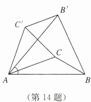 14. 如图,已知 $ \triangle ABC $ 中,$ \angle CAB = 20^{\circ} $,$ \angle ABC = 30^{\circ} $,将 $ \triangle ABC $ 绕 $ A $ 点逆时针旋转 $ 50^{\circ} $得到 $ \triangle AB'C' $,以下结论:① $ BC = B'C' $;② $ AC // C'B' $;③ $ C'B' \perp BB' $;④ $ \angle ABB' = \angle ACC' $,其中正确的有 $ $ $ $.(填写序号)