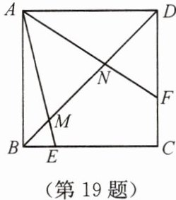 19. (8 分)如图,正方形 $ ABCD $ 中,$ \angle EAF = 45^{\circ} $,连接对角线 $ BD $ 交 $ AE $ 于点 $ M $,交 $ AF $ 于点 $ N $. 求证:$ DN^2 + BM^2 = MN^2 $.