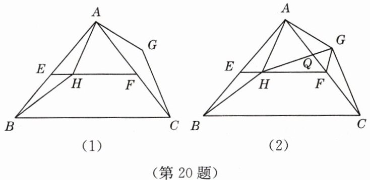 20. (8 分)如图(1),在等腰直角三角形 $ ABC $ 中,$ \angle BAC = 90^{\circ} $. 点 $ E $,$ F $ 分别为 $ AB $,$ AC $ 的中点,$ H $ 为线段 $ EF $ 上一动点(不与点 $ E $,$ F $ 重合),将线段 $ AH $ 绕点 $ A $ 逆时针旋转 $ 90^{\circ} $得到 $ AG $,连接 $ GC $,$ HB $.