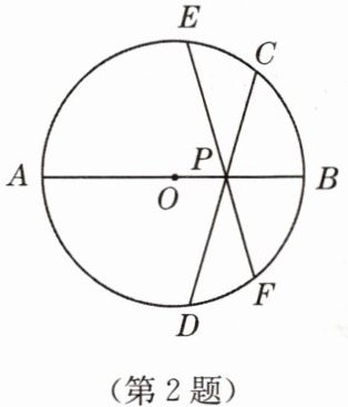 2. 如图,在$\odot O$中,$AB为\odot O$的直径,点$P为OB$上一点(不同于$O$,$B$),$CD$,$EF是\odot O过点P$的两条弦,则图中有____条直径,____条非直径的弦,以点$A$为一个端点的劣弧有____条.