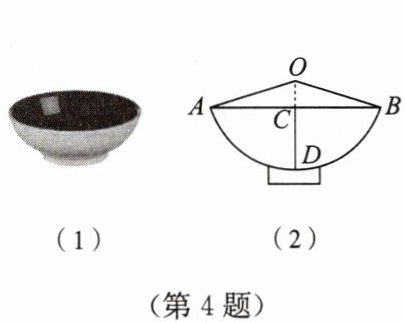 4. 陕西饮食文化源远流长,“老碗面”是陕西地方特色美食之一。如图,图(2)是从正面看到的一个“老碗”[图(1)]的形状示意图。$\overset{\frown}{AB}$是⊙O 的一部分,D 是$\overset{\frown}{AB}$的中点,连接 OD,与弦 AB 交于点 C,连接 OA,OB。已知 AB= 24 cm,碗深 CD= 8 cm,则⊙O 的半径 OA 为( )