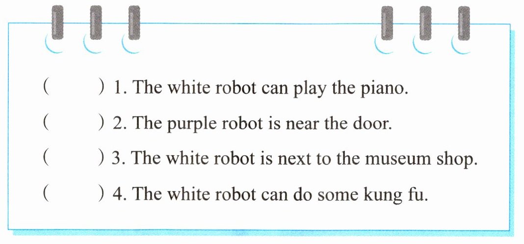 一、Listen and number. Wu Binbin 和 Robin 商量着要去博物馆参观机器人展览。请听一听,按照他们所谈内容的先后顺序用 1—4 为图片排序。