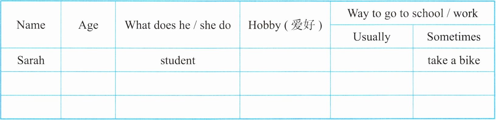 四、Read and fill. 这是 John 采访 Sarah 的记录。请你读一读,根据记录内容,填写表格。