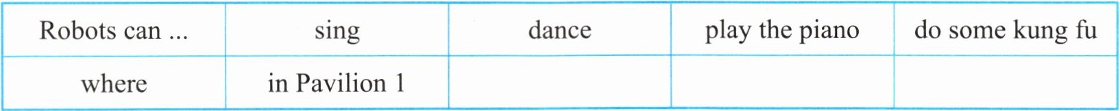 任务一 Robots can... sing dance play the piano do some kung fu where in Pavilion 1 in Pavilion 2 near the door next to the museum shop 任务二 1. It's near Wu Binbin's school. 2. It has a robot exhibition. 3. There are two pavilions. 4. Yes, they can.