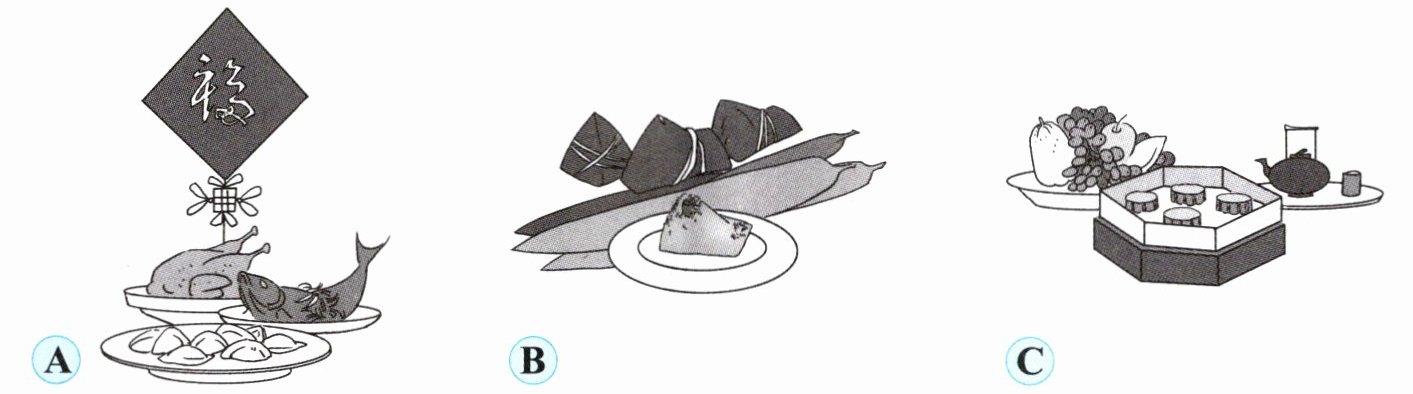 一、Listen and tick. 中国传统节日丰富多彩,在今天的“中国传统小课堂”上,老师和大家分享的是哪一个节日呢?请听一听,勾选出正确图片的字母标号。