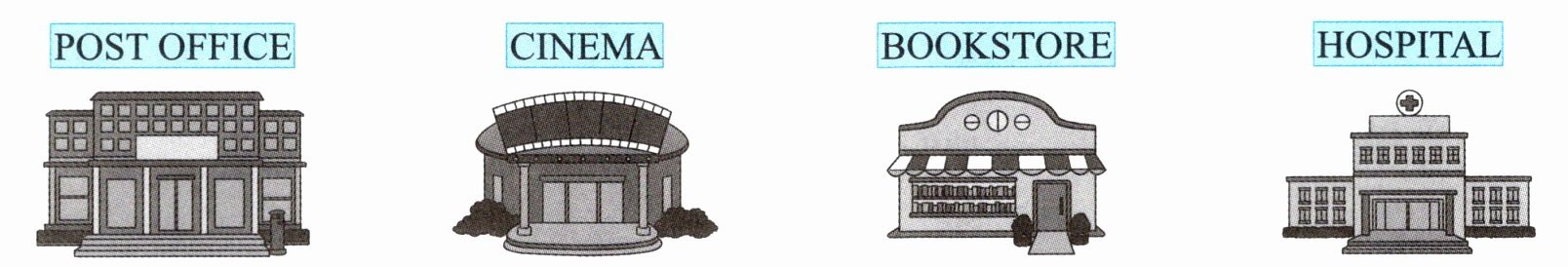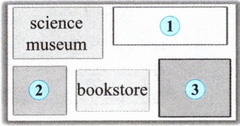 The bookstore is between the hospital and our school. The hospital is next to the science museum. There is a post office next to our school.