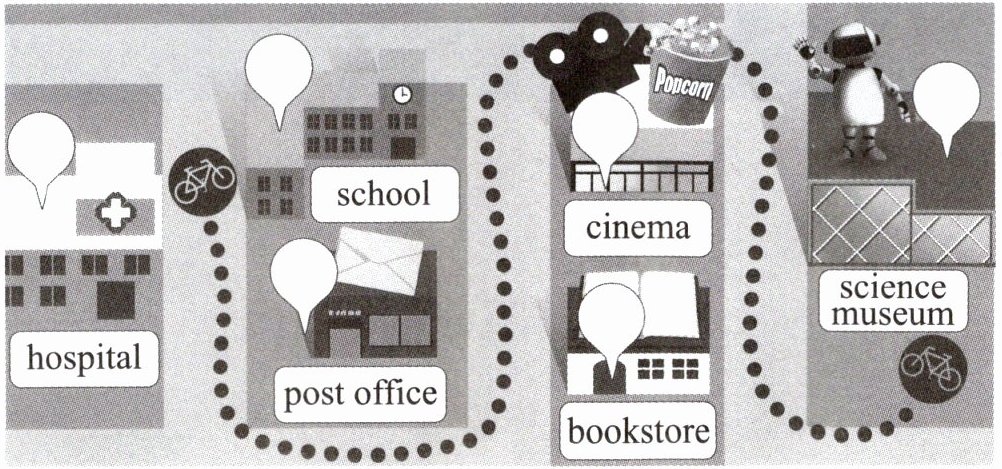 三、Look and finish. Zhang Peng的好朋友Xiao Ming从他的学校出发,骑自行车前往科技博物馆。请看一看,完成任务。