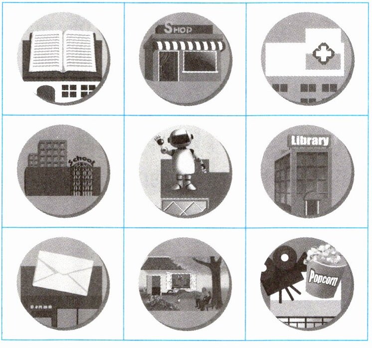 5. The library is between the hospital and the cinema. / It's near/next to the museum.