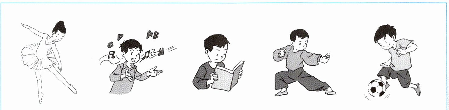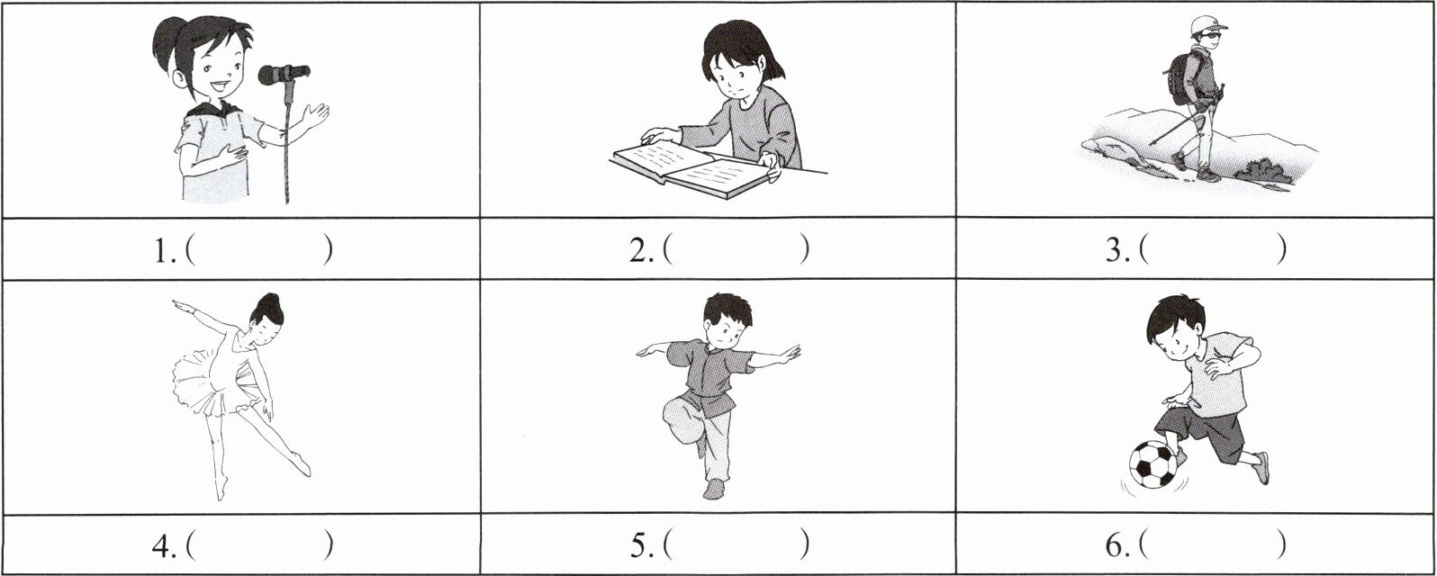 一、Listen and number. 社团时间到了,同学们正在参加各种社团活动。请听一听大家都在进行哪些活动,按听到的顺序用 1—5 为下面的图片排序。