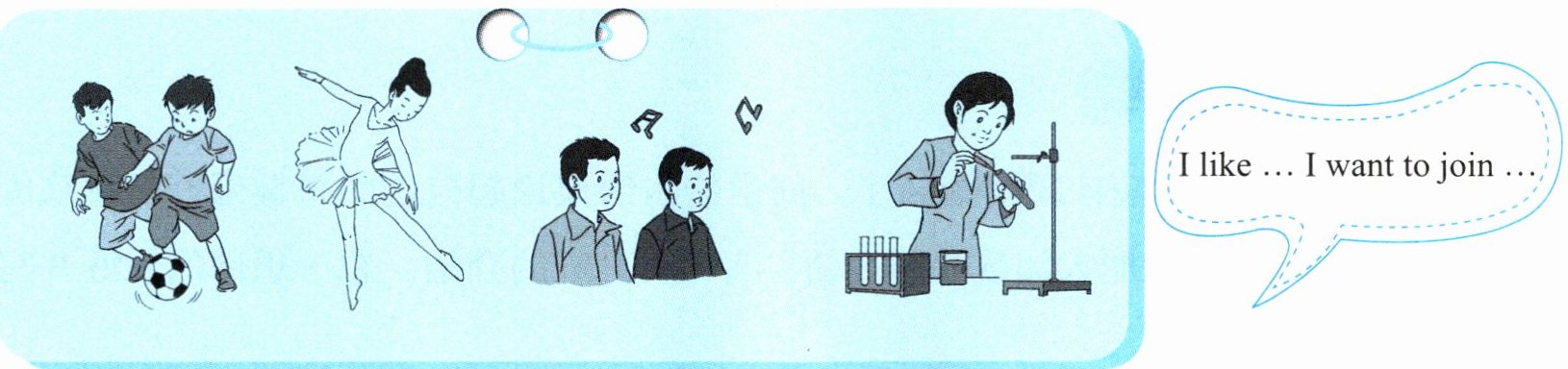 学校的社团多种多样,你想要加入什么社团呢?请看一看,说一说。