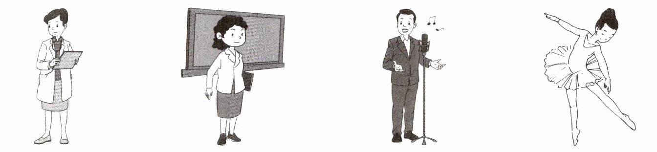 Bob's father is a taxi driver. He is a good driver. He usually works very late. Lucy's mother is a dancer. She is very beautiful. Anna's uncle is a singer. He sings well. Lily's grandpa is a painter, and her grandma is a dancer. Jim's mother is a teacher, and she teaches English.