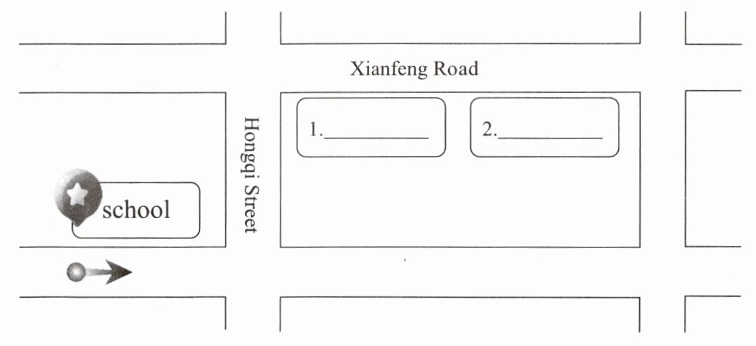 任务一 1. cinema 2. restaurant 任务二 1. They have lunch in Old House Restaurant. 2. It's on Xianfeng Road. It's next to a big cinema. 3. They get there on foot. They turn left at their school and go straight on Hongqi Road. Then turn right at the cinema. 4. Yes, it is. 5. He likes the dumplings and tofu.