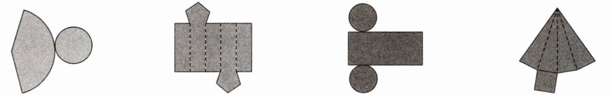 (1)你了解直棱柱、圆柱、圆锥的侧面展开图吗?你能想象如图 5-14 所示的平面展开图能围成哪些几何体吗?在图 5-14 的横线上填写相应几何体的名称.