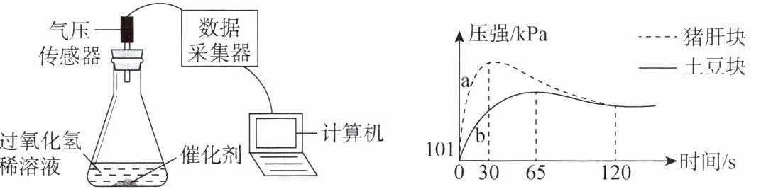 【探究二】取大小相同的新鲜土豆块和新鲜猪肝块作催化剂,分别加入 10 mL 相同浓度的过氧化氢稀溶液后,用传感器测量装置中气压的变化。