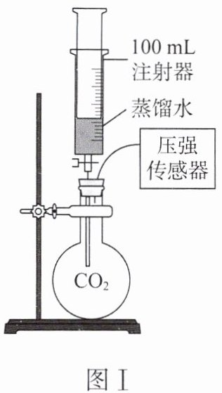 10. 某小组利用如图Ⅰ所示的装置研究 $ 25^{\circ} {C} $ 时二氧化碳的溶解性。打开弹簧夹,向 3 个充满二氧化碳的 $ 100\ {mL} $ 烧瓶中,分别注入 $ 20\ {mL} $、$ 40\ {mL} $、$ 60\ {mL} $ 蒸馏水,关闭弹簧夹,振荡烧瓶,瓶内前后压强的变化如图Ⅱ所示。下列说法不正确的是(