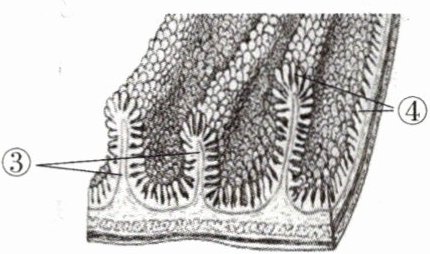 (4)小肠是人体吸收营养物质的 场所。这不仅与小肠的长度有关,还由于小肠壁向肠腔内形成如下图所示的③ 、④ 和微绒毛等结构,使小肠的吸收面积大大增加。