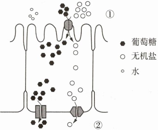 (1)图示过程发生在小肠 细胞。根据图示可知,该部位小肠细胞能吸收 、 和 。据此推测,该部位细胞还能吸收 (写3种不同类别)等有机物。