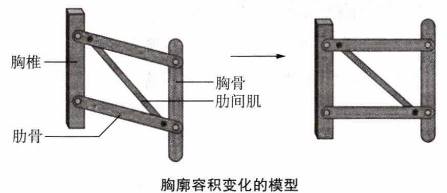 1. 有同学制作了一种胸廓容积变化的模型(见下图)。模型的“胸椎”“胸骨”“______”用木条模拟,“______”用橡皮筋模拟。他认为该模型能体现呼吸运动时,胸廓容积发生的全部变化及其原因。