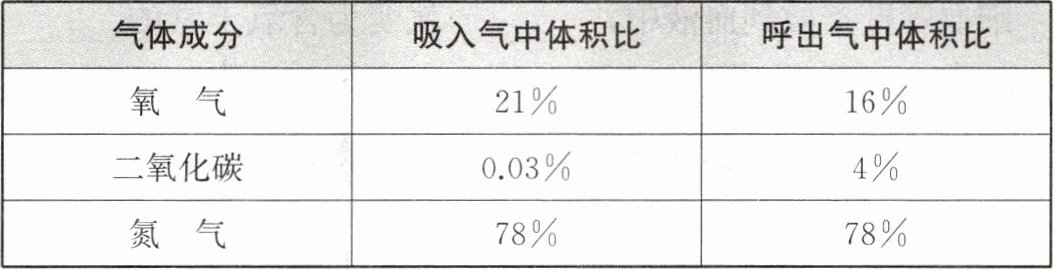 |气体成分|吸入气中体积比|呼出气中体积比|